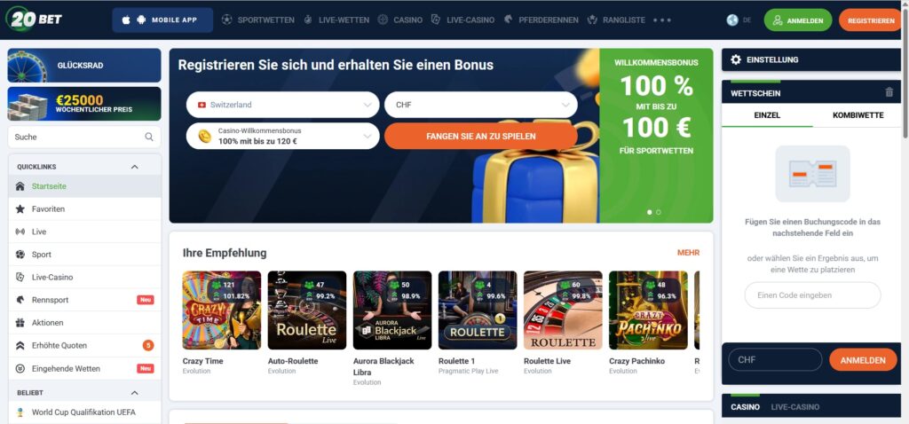 | 20Bet | 100% bis CHF 100 + 25 Freispiele | Schnelle Auszahlungen, Sportwetten und Casino, mobil optimiert | Jetzt prüfen |
